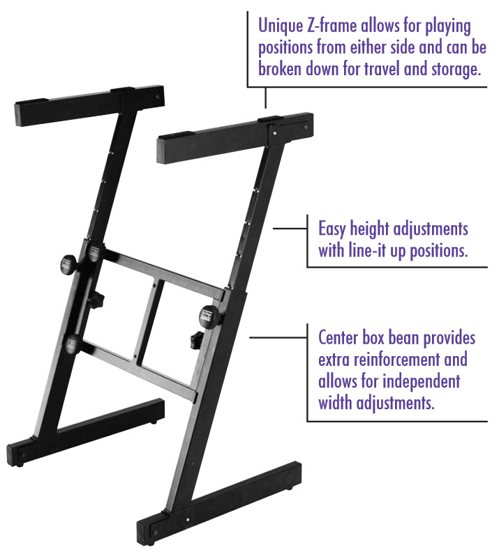 This stand is a great this compact, all-new stand can hold a heap of weight up to 100Klgs. and also the ability for an independent height and width adjustments, and even better to fold and store away. The design of the Z-frame allows playing from either side and can be broken down and locked together for transport. Because if its expandale design it will also allow you to hold 55-key keyboards in the compact position and up to a piano sized 88-key keyboards at its maximum width.