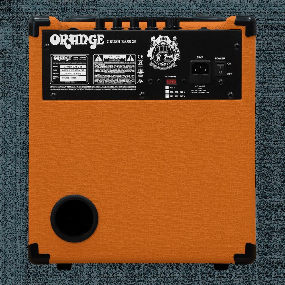 You wouldn’t compromise your bass sound with the band, so why should practising at home be any different? Whilst the Crush Bass 25 may be the smallest model in the Crush Bass amp range, it still retains the warm and rounded tonal character that make Orange Amps the choice of some of the world’s most iconic bass players. This 25 Watt combo features an all-analogue signal path, a ported cabinet for improved low end response plus a highly responsive active EQ section. Like the rest of the Crush Bass range, the amp’s variable parametric mid band allows for unlimited control over a broad range of frequencies in addition to the bass and treble. Dial in a massive range of classic bass tones or create your own. With an integrated tuner, an aux. input for backing tracks and a headphone output with our CabSim circuitry, the Crush Bass 25 is the perfect miniature rig for all players on which to hone their tone. • FEATURES: ACTIVE 3 BAND EQ, PARAMETRIC MID CONTROL, CHROMATIC TUNER, CABSIM-LOADED HEADPHONE OUTPUT & AUX IN • CONTROLS (RIGHT TO LEFT): -6DB PAD SWITCH, BASS, FREQUENCY, MIDDLE, TREBLE, VOLUME • (BELOW) INTEGRATED CHROMATIC TUNER • FINISH OPTIONS: ORANGE OR BLACK BASKETWEAVE VINYL • OUTPUT POWER: 25 WATTS • SPEAKER: 8? • UNBOXED DIMENSIONS (W X H X D): 32.5 × 36.5 × 23.5CM (12.8 × 14.37 × 9.25?) • UNBOXED WEIGHT: 8.3KG (18.26LB)
