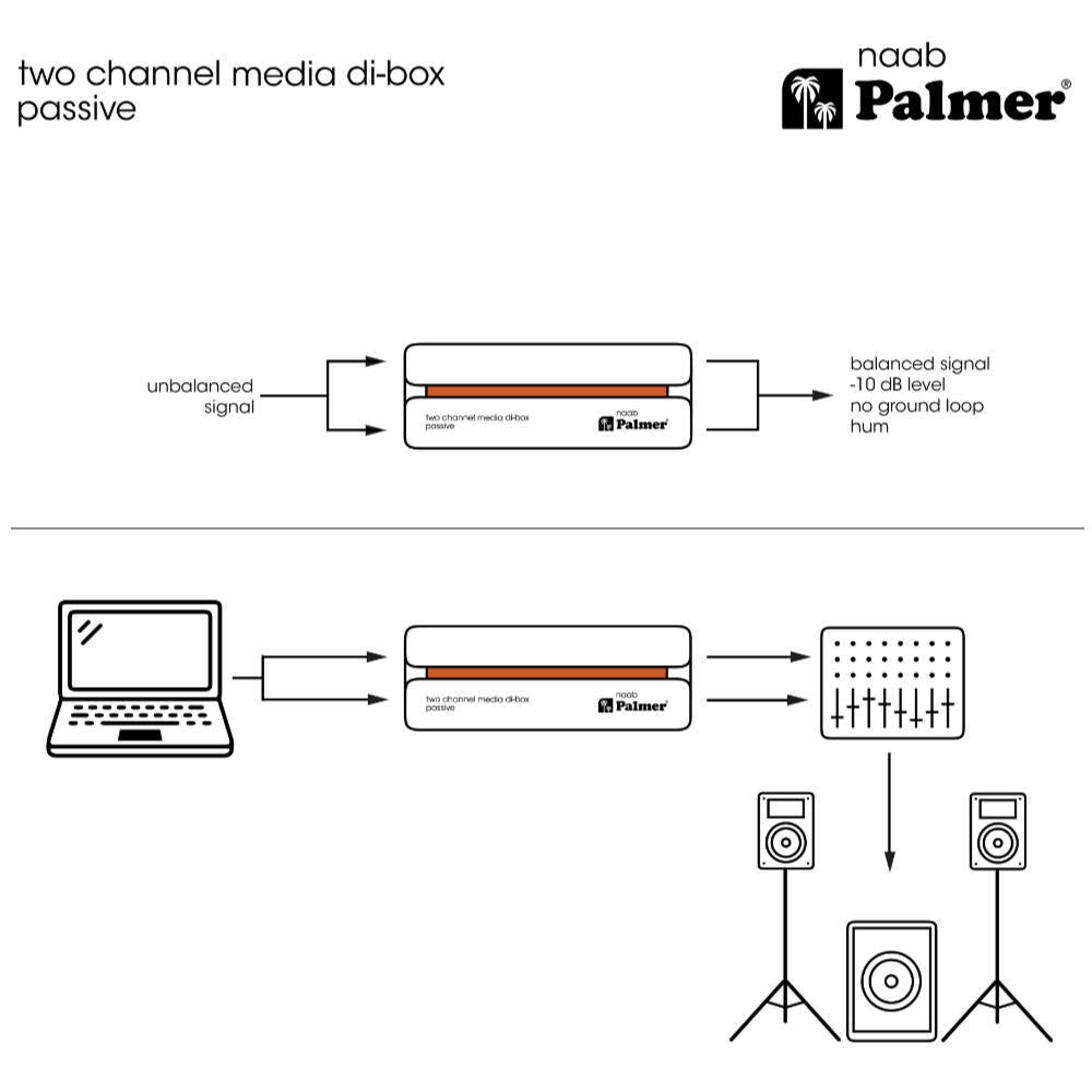 If you connect a laptop to a sound system, in many cases the sound quality leaves a lot to be desired. It hums and crackles, sometimes there is also a loss of sound in the low and high frequencies. The Palmer naab, a two-channel media DI box, provides a reliable solution for this situation.