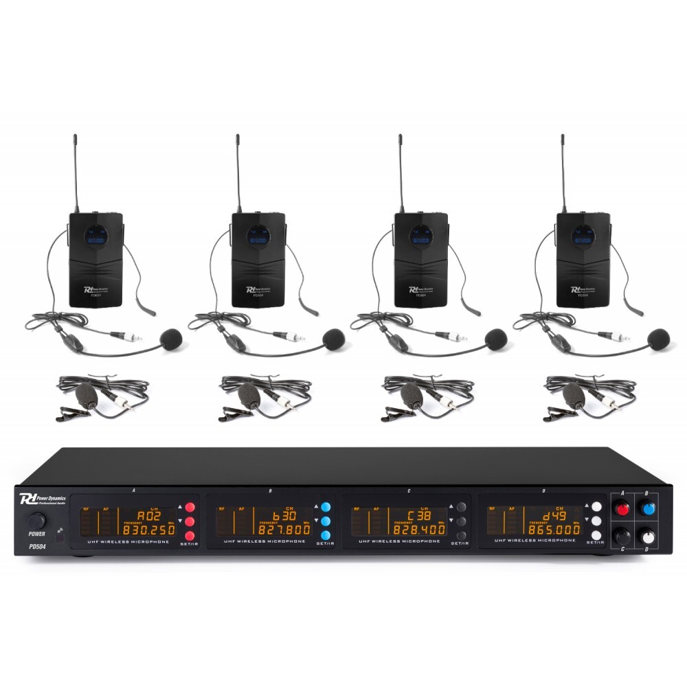 This impressive sounding Power Dynamics UHF 4 microphone wireless system allows you to operate 4 microphones at the same time. Each microphone is colour coded allowing for quick microphone identification making the job of your sound man to make adjustments while the mics are being used on stage super easy. Excellent sound quality for vocal and PA applications.- 4x Bodypack with headset and tie-clip microphone and mute function