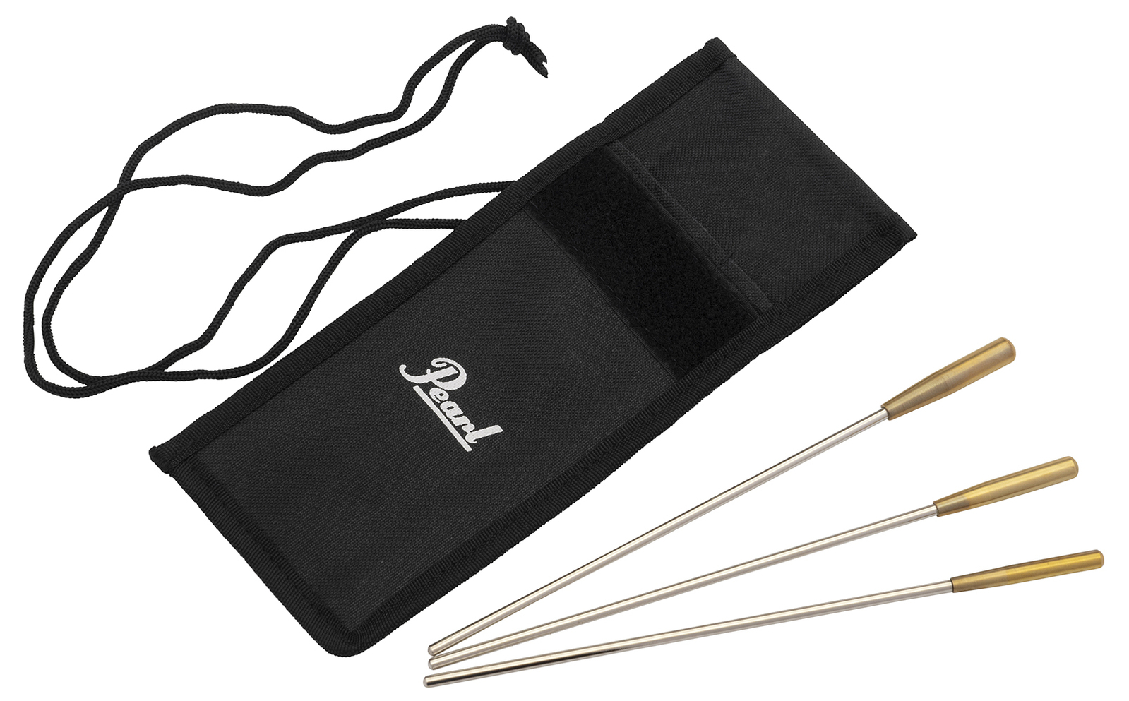 The Elite Series Triangle Beaters features three 4 mm steel strikers with three different weighted brass handles. The small handle is 6.3 mm and weighs 27 grams, the medium handle is 7.8 mm and weighs 36 grams, and the large handle is 9.3 mm and weighs 45 grams. The strikers come complete with a storage pouch that seals with a velcro strip to secure the strikers during transport.