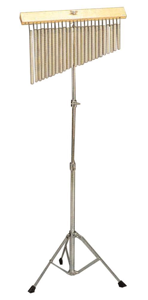 24 hanging chimes on bars. Different-sized hollow bars in the colour of 24k gold. complete with a single braced stand and attachments finished in chrome.