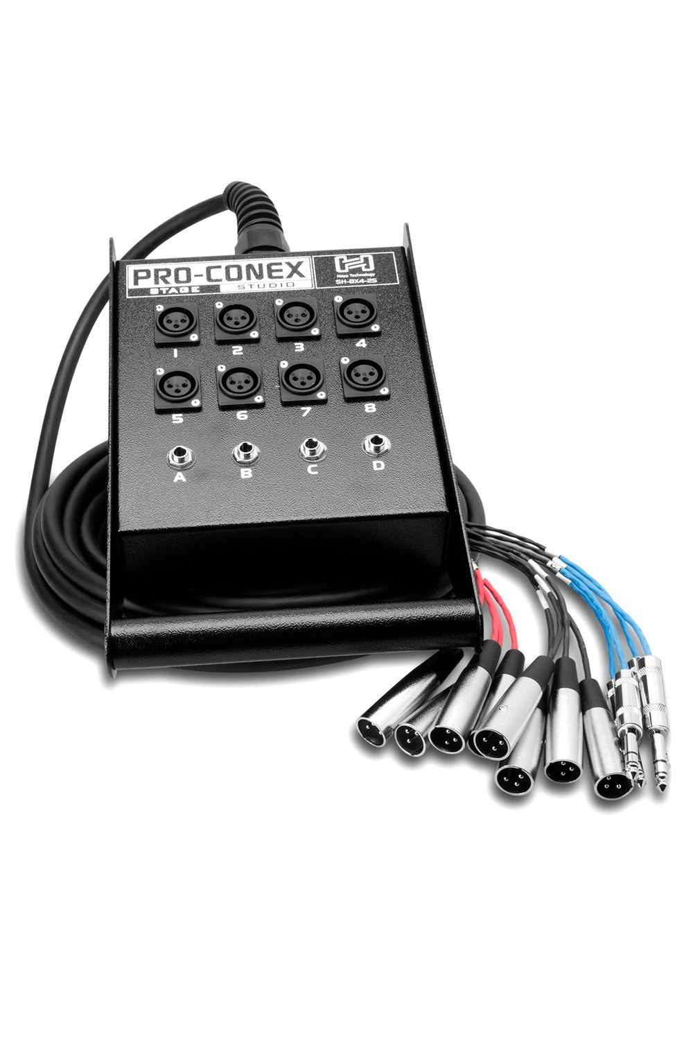 Pro-Conex Stage Box Snake, Hosa 8 x XLR Sends and 4 x 1/4 in TRS Returns, 50 ft | Serviceable, all-metal connectors | Individually shielded 24 AWG x 2 OFC conductors | Heavy-gauge, rolled-steel chassis with black enamel textured finish | High-contrast silk-screened lettering | Foil-wrapped, heat shrink-protected internal wiring | Heavy-duty wire mesh hanger/strain relief