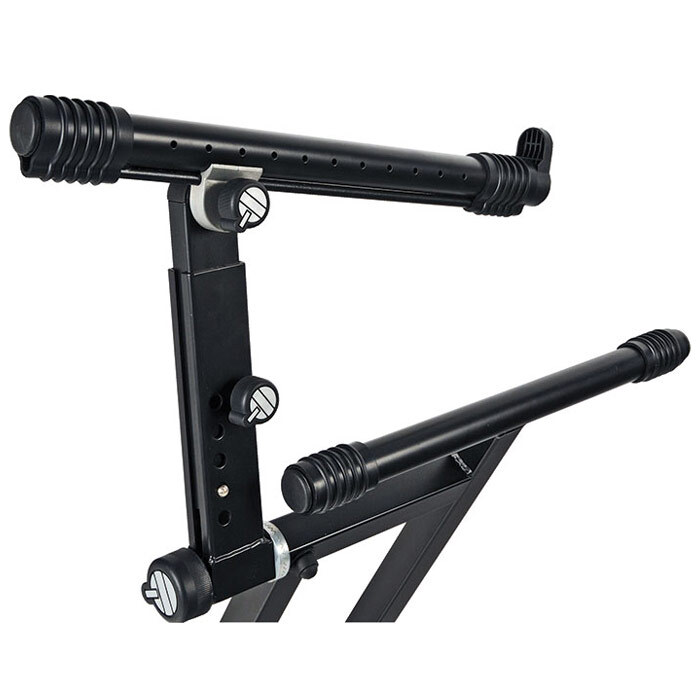 The QL-742 is a Pro Series, Double-brace X-type keyboard stand with a height, tilt, angle & depth-adjustable second tier. It is the absolute, hands-down choice of most professional musicians because of its adjustability, strength, and reliability. The QL-742 ProSeries stand features the new Quik Lok “push to adjust” locking disc system with a user-friendly push button and super heavy duty 30 mm x 30 mm steel tube bracing for extra structural support.