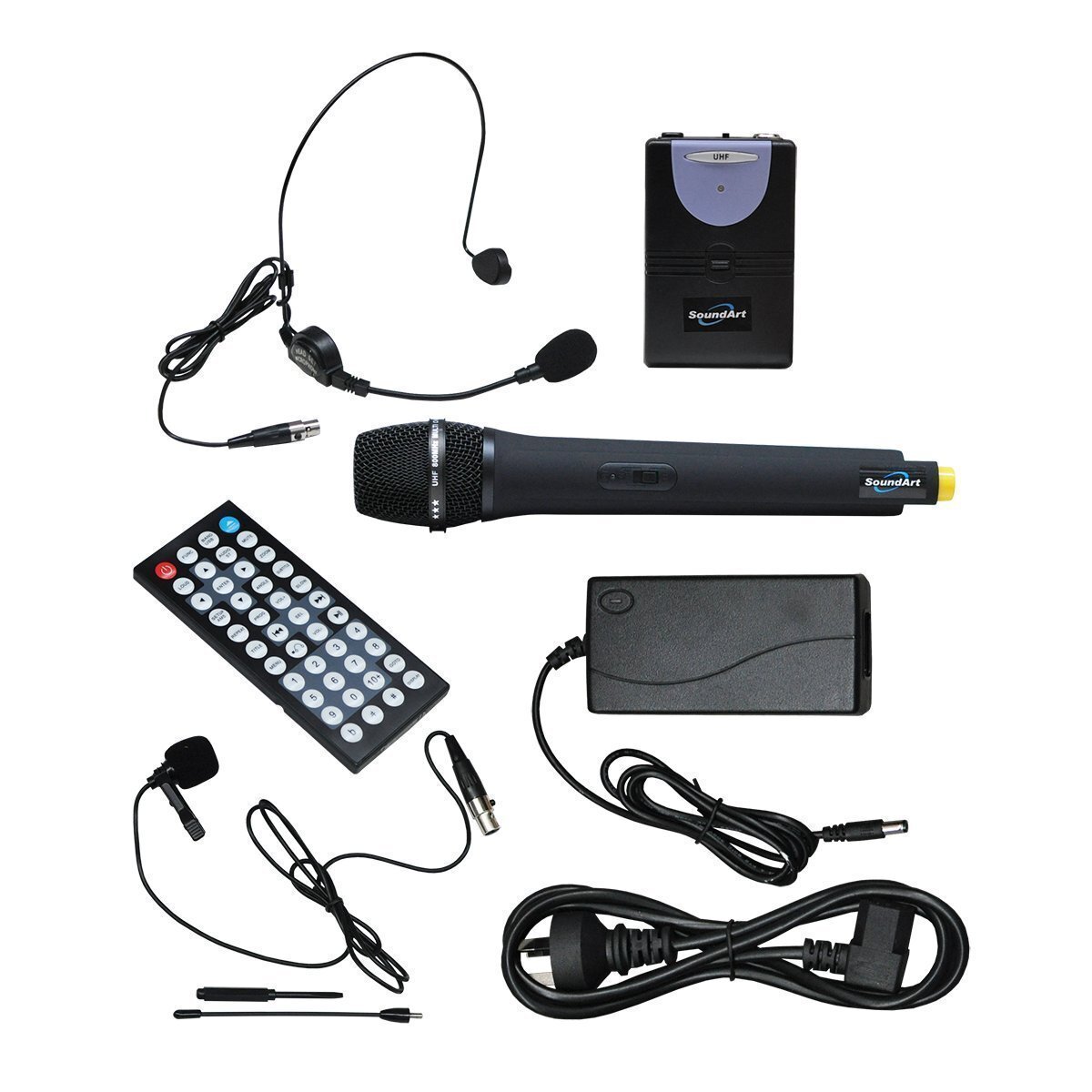 Comes complete with: 40 watt portable rechargable PA with 2 X Wireless Systems - Hand-Held Microphone Body-Pack Set comprising Transmitter with Lavelier (Lapel) and Headset Microphones DVD Remote Control