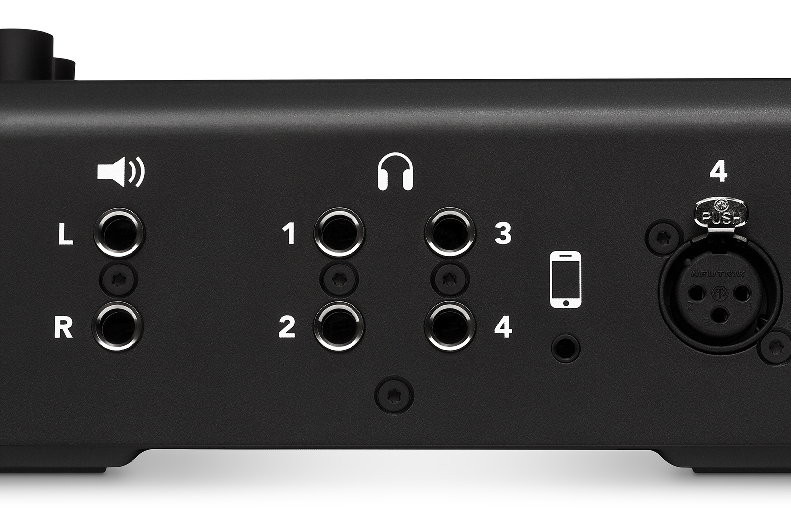 The RØDECaster Pro comes equipped with 4 high-powered headphone outputs using discrete circuitry for clarity and presence, each with its own volume level. A switchable headphone limiter ensures no deafening spikes. Left and right TRS speaker outputs provide quality playback listening, or can feed a PA for an audience if podcasting live.