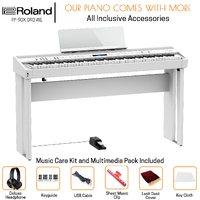 The Roland FP-90x digital piano delivers an authentic grand piano feel through the use of the PHA-50 (Progressive Hammer Action with Escapement) keyboard, which combines wood and molded materials for great feel and lasting durability. It utilizes SuperNATURAL Piano Modeling technology instead of conventional sampling for a richer and more detailed piano sound, amplified by the four built-in speakers. This digital piano also features a premium selection of electric piano, strings, organ, and synth sounds, 30 registrations for storing favorite sound setups (including layers and splits for live performance), a mic input, vocal effects and Bluetooth technology (to connect your phone wirelessly).