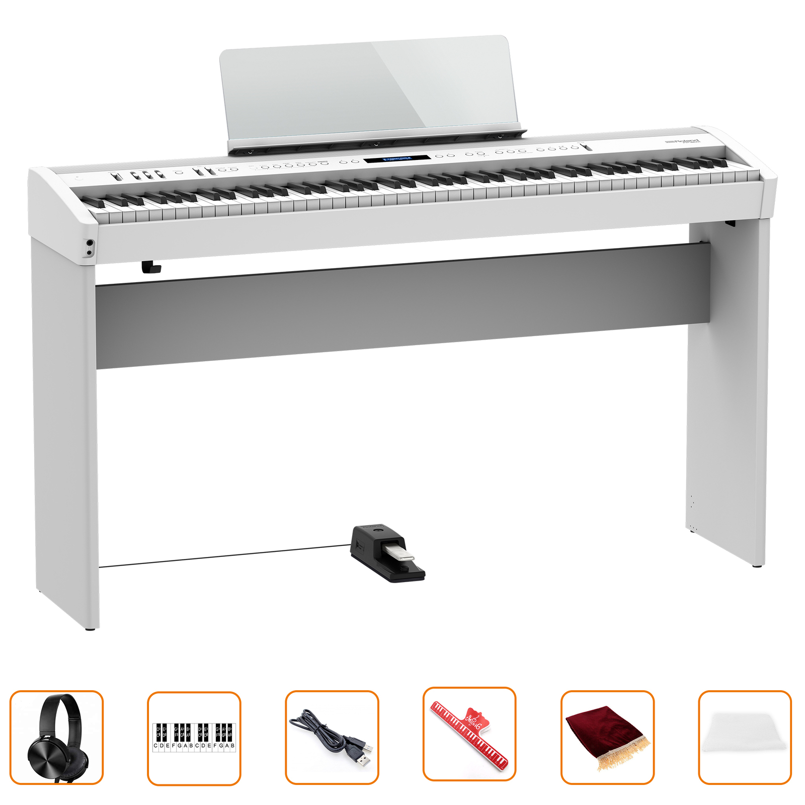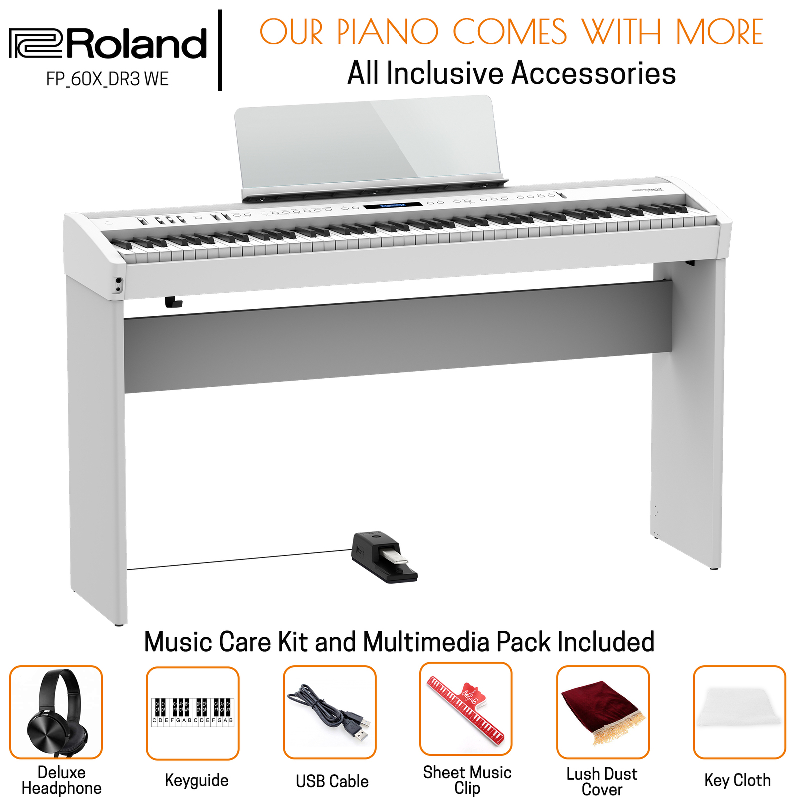 Roland FP60X Digital Portable Piano (White) Bundle w/ Wooden Stand, Bench, Single Pedal + Accessories