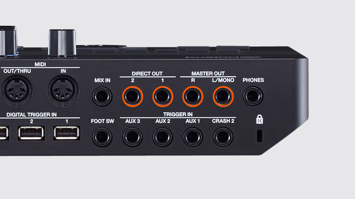 - Stereo mix output and two assignable outputs for sending individual drum sounds to a PA mixer