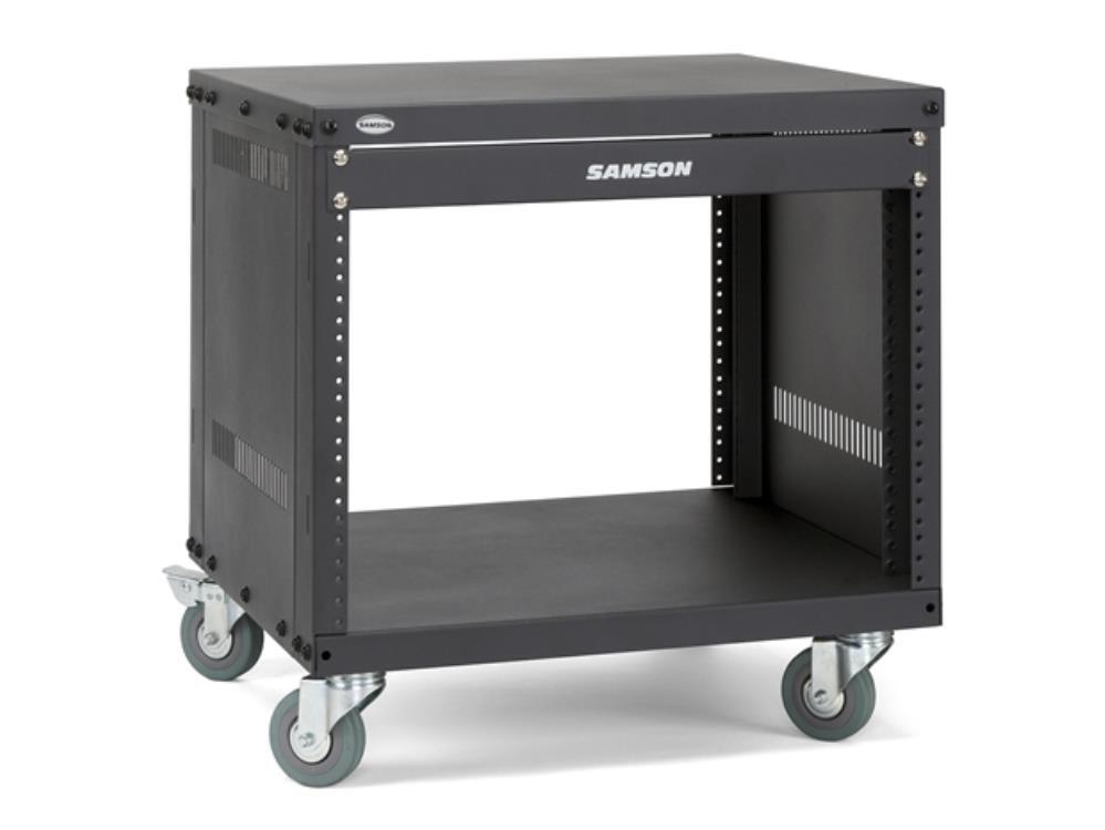 Samson's rugged equipment racks are solid steel and feature fully enclosed steel side panels. The 8-sapce SRK8 is set upon 4 heavy-duty, 3-inch (75 mm) casters with locking fronts. Each Samson equipment rack includes a single-space, flanged blank panel. The truly innovative thing is that the unique steel support bar construction allows the racks to be assembled to accept either the European or US thread sizes.