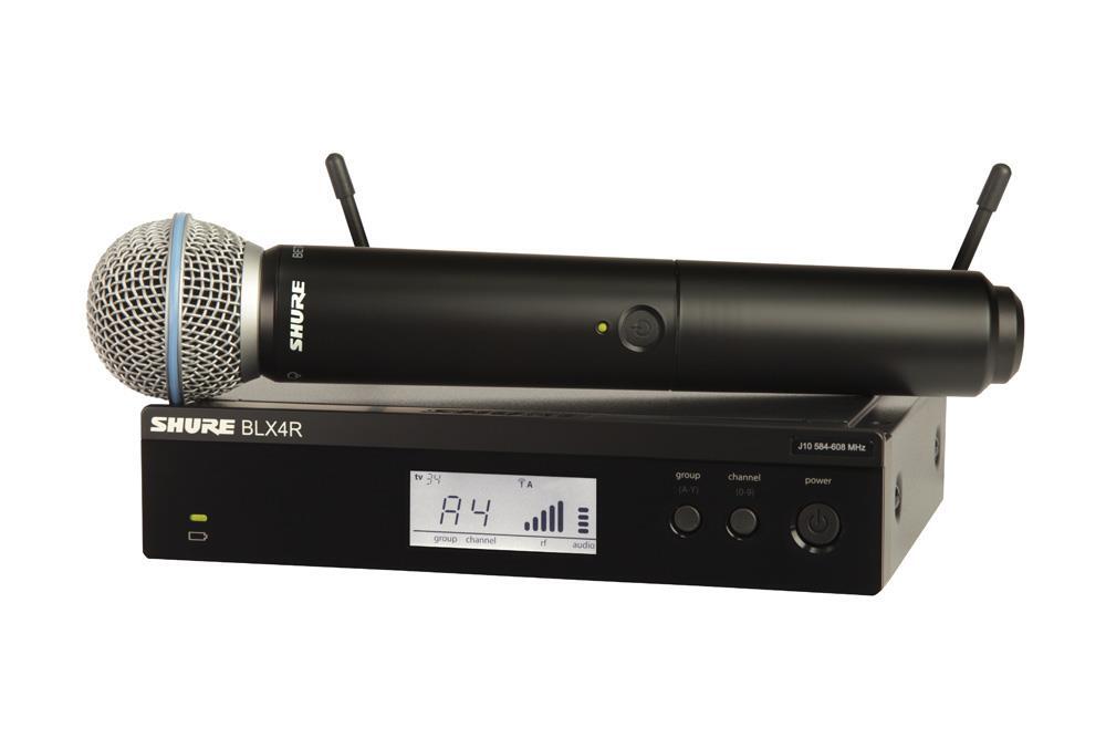 Shure BLX Wireless Systems combine professional-quality sound with simple setup and an intuitive interface for legendary audio performance right out of the box. Precision-built and available in a variety of configurations, it's the most accessible way to own the stage. System Includes BLX2 Handheld transmitter with BETA58 microphone cartridge. BLX4R Rack-mountable receiver with removable antennas for quick distribution.
