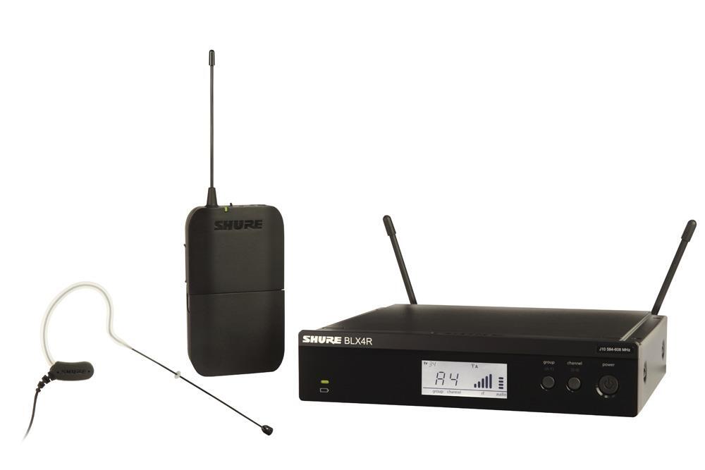 Shure BLX14RM53K14 Wireless 1/2R Headworn System BLX1 Tx; MX153 Mic; BLX4R Rx Auto Setup: 614-638MHz