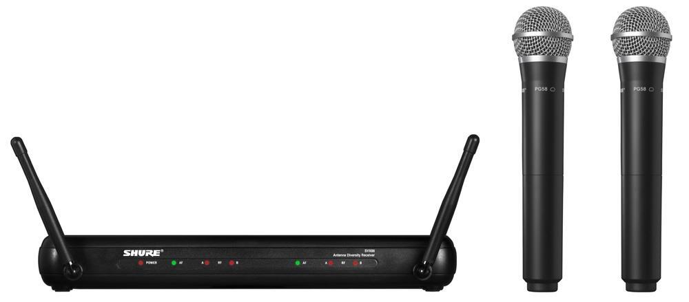 Includes SVX88 Dual Diversity Receiver, and (2) PG58 Handheld Microphone Transmitters.