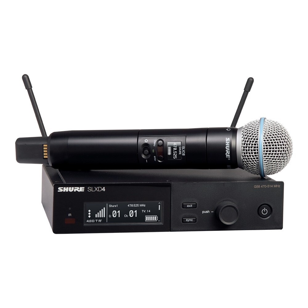 Featuring a BETA®58A handheld wireless microphone transmitter and SLXD4 Digital Wireless Receiver, SLXD24/BETA58 combines professional features with simplified setup and operation. SLX-D Digital Wireless delivers transparent, 24-bit digital audio and rock solid RF performance with easy setup and rechargeability options in a suite of versatile wireless system configurations. Featuring industry-leading digital wireless technology and design, the SLXD2 easily syncs with a wireless receiver. A variety of interchangeable vocal microphone choices guarantees the right solution for a wide range of applications, from day-long conference to night-time performances.
