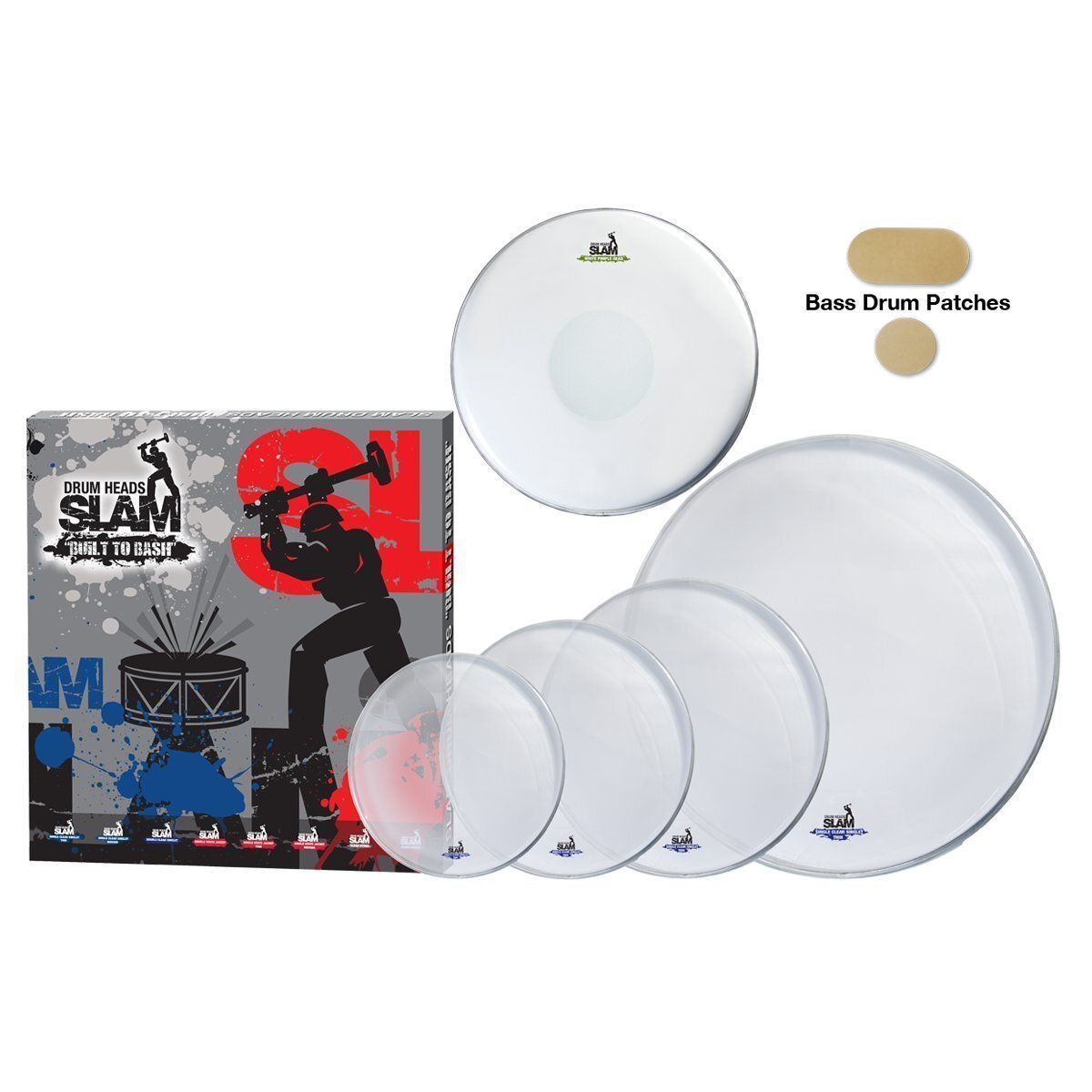 The Slam SDHP-1PCL-TF22 Single Ply Clear Drum Head Pack includes a 10", 12" and 14" drum head, and a 22" bass drum head. All packs also include a white 14" coated snare head, plus a single and double bass drum patch.