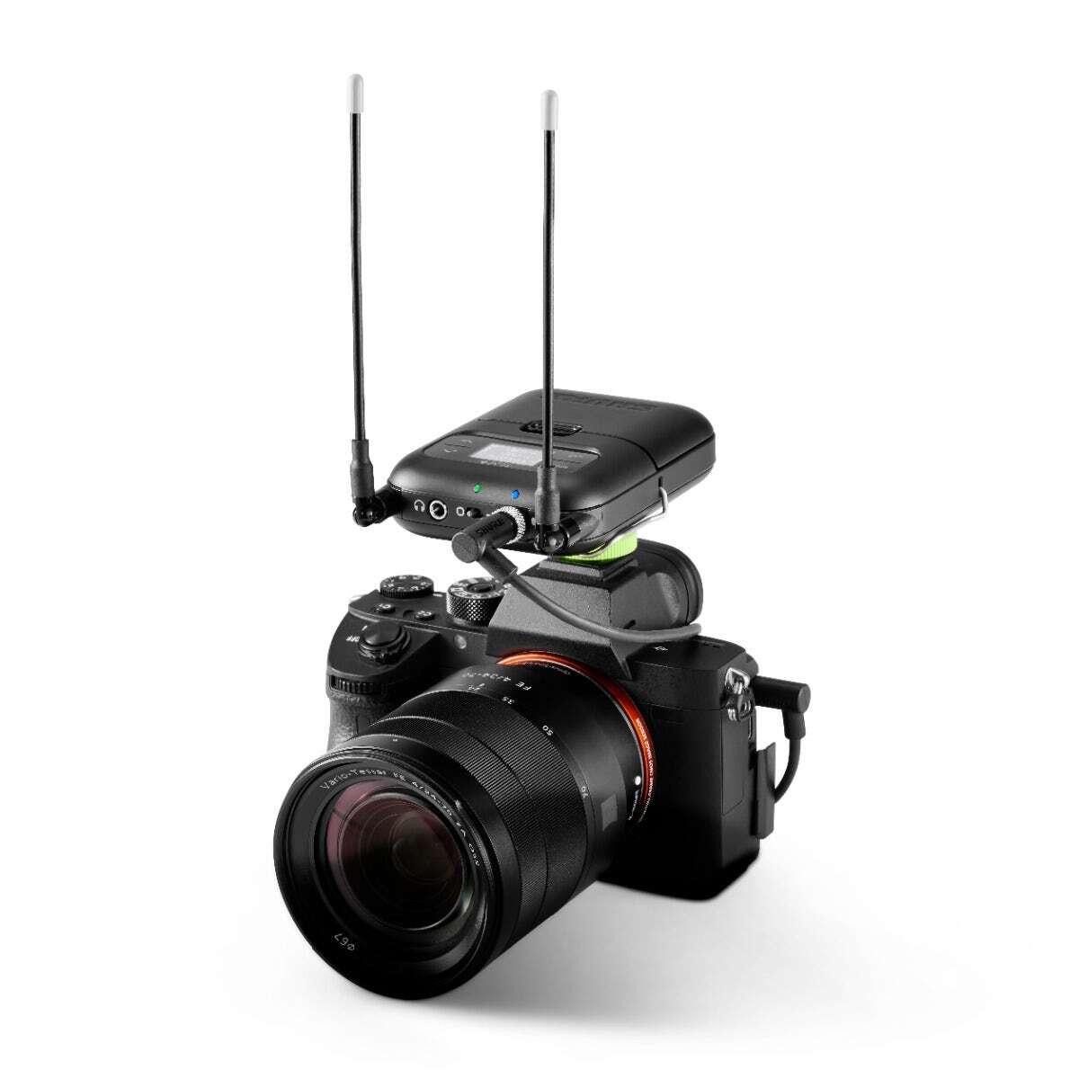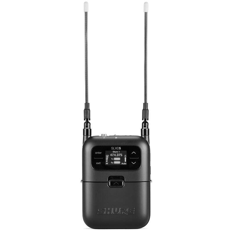 SLXD5 Single-Channel Portable Digital Wireless Receiver for use with digital cameras or in audio bag applications. The bright OLED screen displays audio and RF meters, tuned system frequency and remaining battery life. The control panel allows configuration of the receiver, gain settings, and to toggle through multiple sources for monitoring from a single receiver in Multi-Mic Mode.