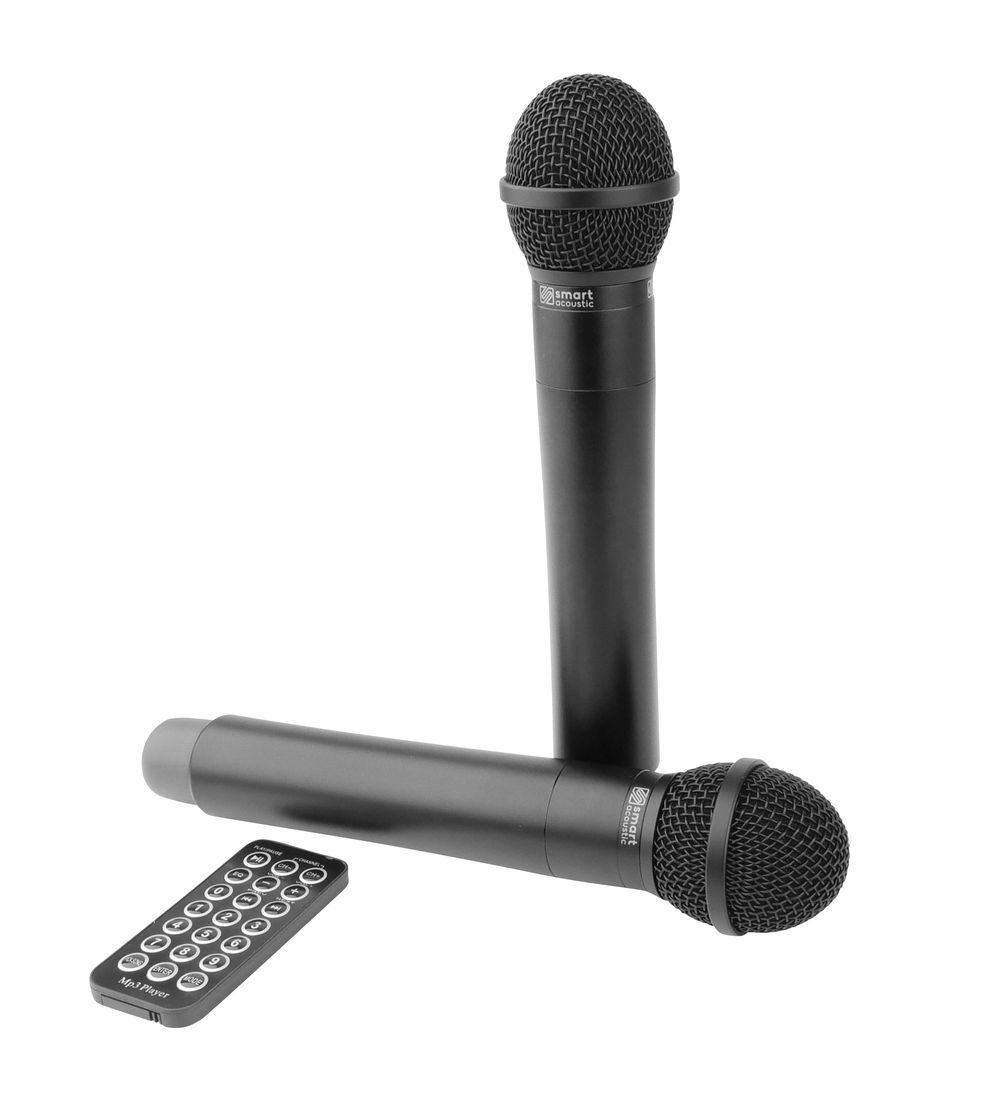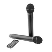 Comes standard with Two Wireless Microphone Receivers and Two Handheld Microphone Transmitters, in the (655-679MHZ) frequency band.