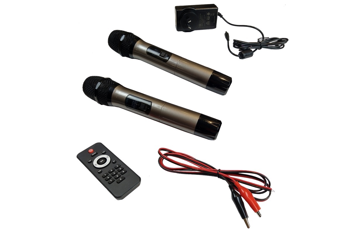 All-in-One Portable Active PA System with 12" Professional Speaker, Amplifier Built-in with USB/SD.MMC Card Reader, Guitar/Mic Inputs, Rechargable Battery, Equaliser & Hand Wheel - 2 WIRELESS MICROPHONES