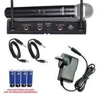 The receiver contains two separated unbalanced output for 2 channels and an unbalanced output for 2 channels mixed, and has level controls for each channel; The microphones are powered by 2x AA batteries (included) and a power adaptor is supplied for the receiver. Ideal for schools,churches, weddings, gyms, karaoke, functions, etc. You can connect the Sonken WM-600D receiver unit directly to either your karaoke machine or PA amplifier microphone input using the Sonken WN600D's mixed 6.35mm microphone output jack (1x cable included)
