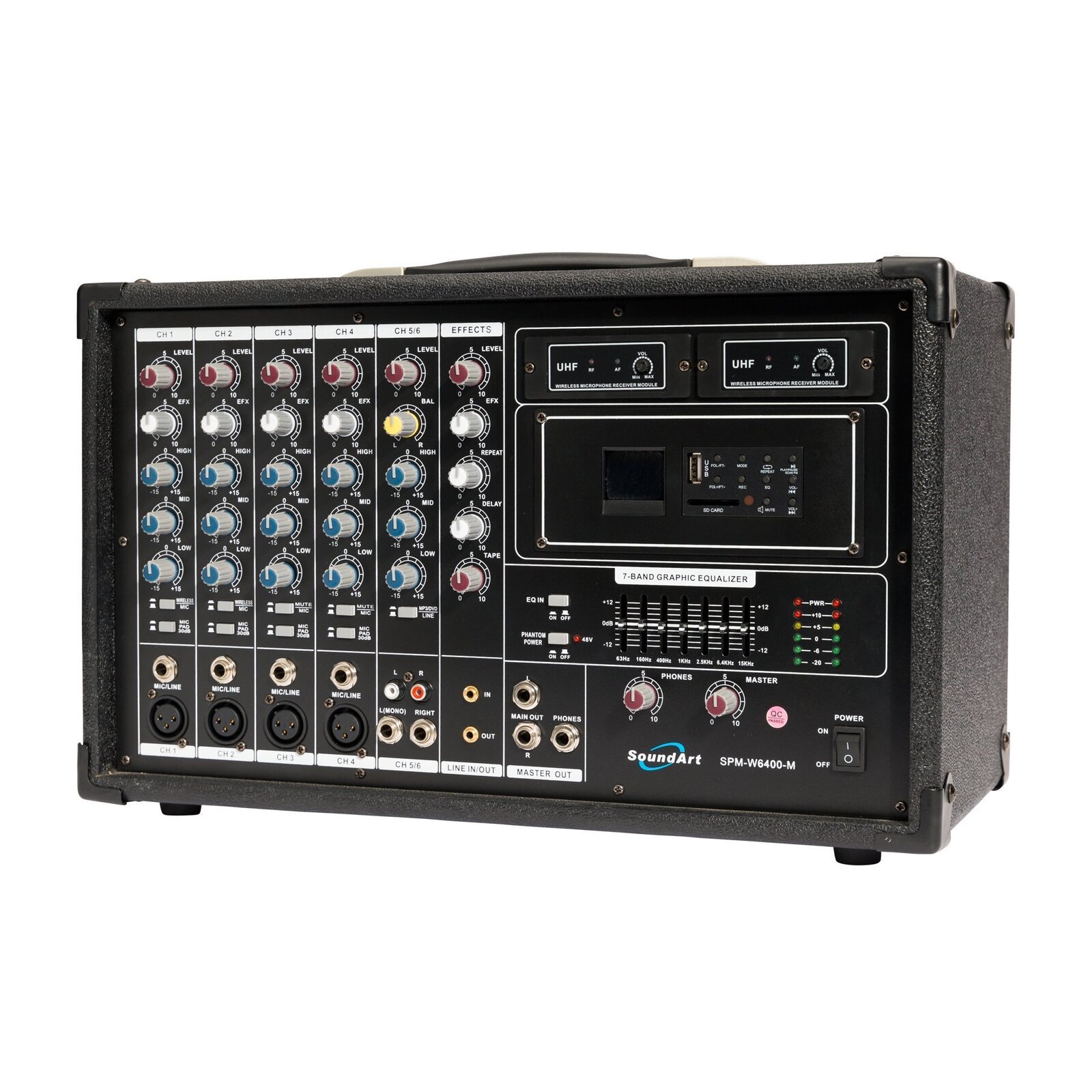 The SoundArt SPM-W6400M is a 6 channel Class D powered mixer with MP3 player, perfect for a wide variety of public address and event applications.