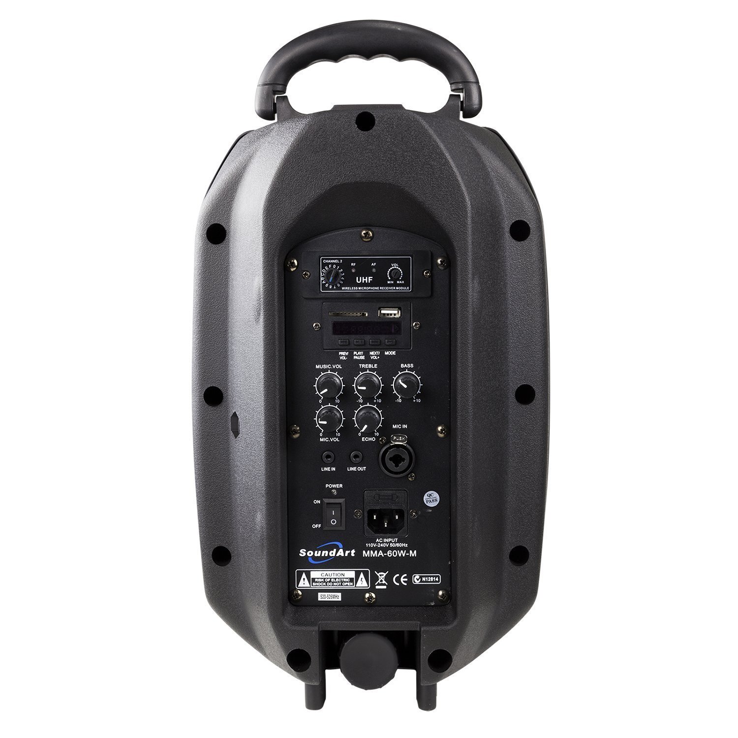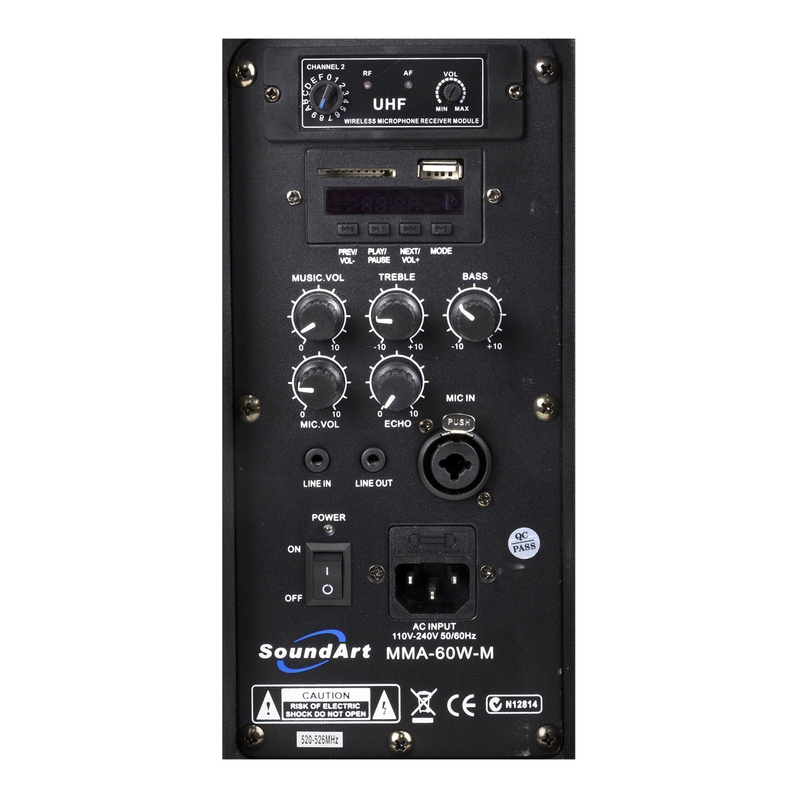 The SoundArt MMA-60W-M Ultra Compact 60 Watt Amplifier gives you 60 watts of power in an easy to carry ABS moulded cabinet loaded with an 8" speaker and horn. It features a built-in MP3 player which lets you play files from either an SD card or USB port. You can also control track selection and volume with the supplied remote control unit.