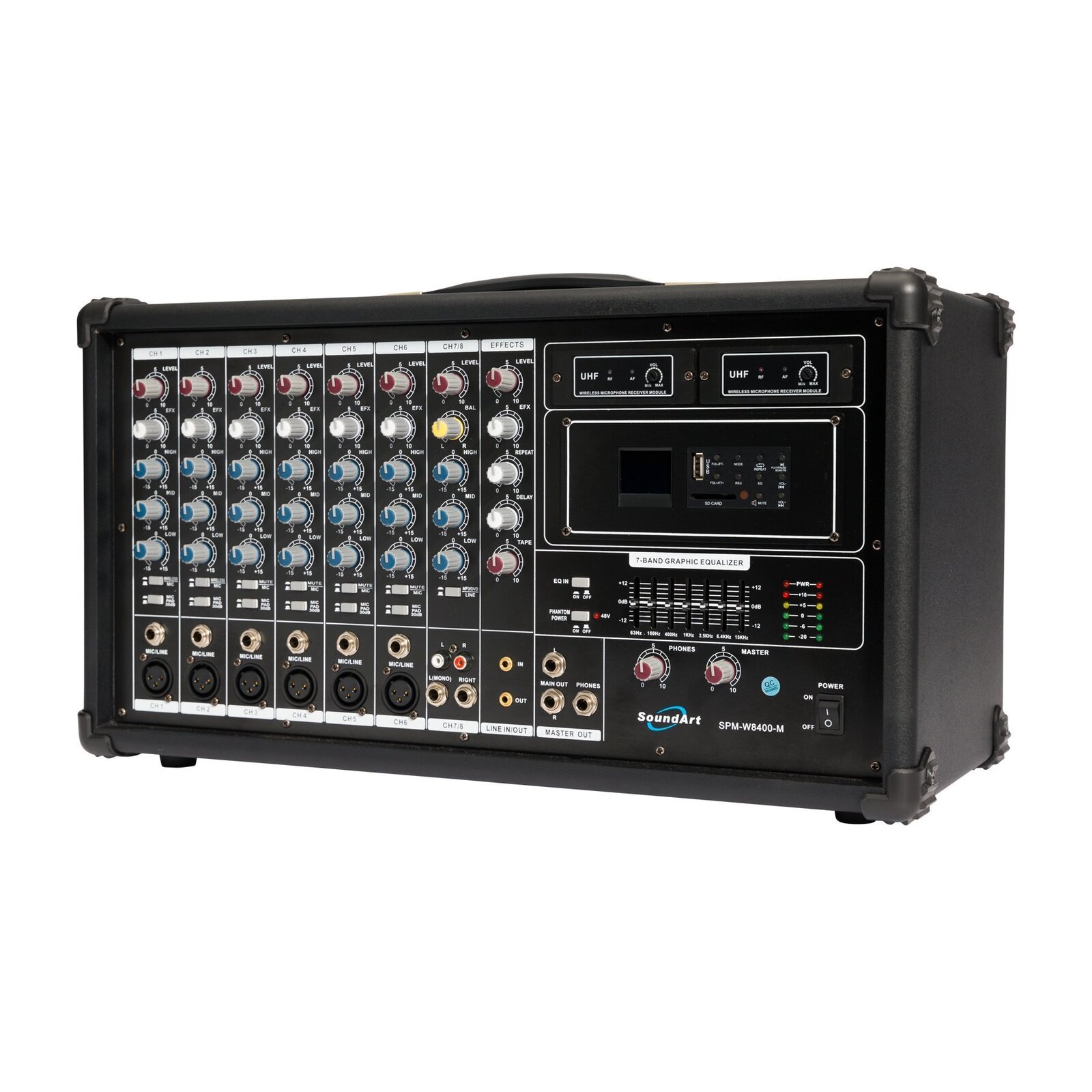 The SoundArt SPM-W8400M is a 8 channel Class D powered mixer with MP3 player, perfect for a wide variety of public address and event applications.