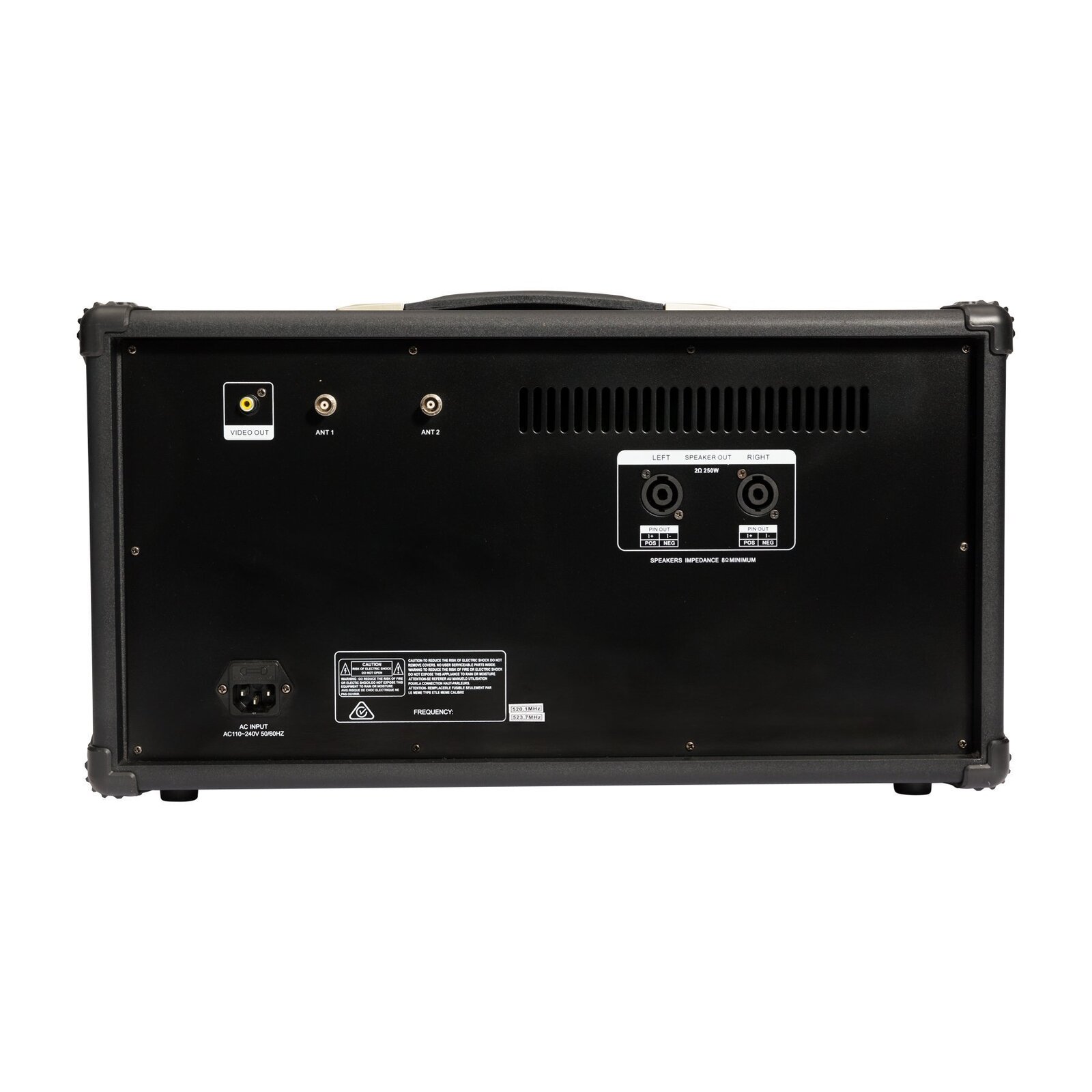Includes hand-held wireless microphone, wireless body pack transmitter, lapel microphone, headset microphone, antennas, padded transport cover and remote control.
