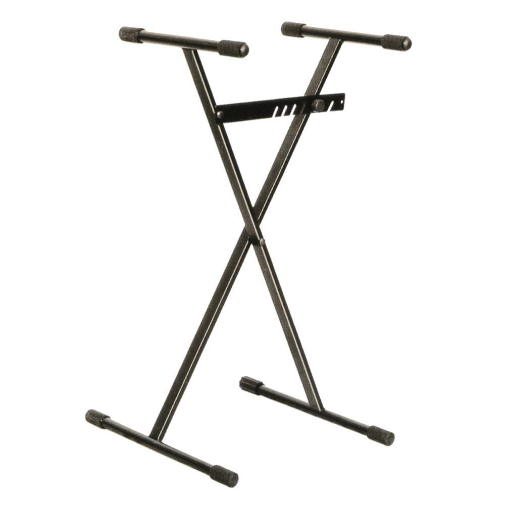 The Crown KS-007 is a heavy-duty X-style folding keyboard stand which features a bar-latch locking system for height adjustment, as well as high quality rubber keyboard grips. Superbly finished off with a non-reflective black powder-coat finish.