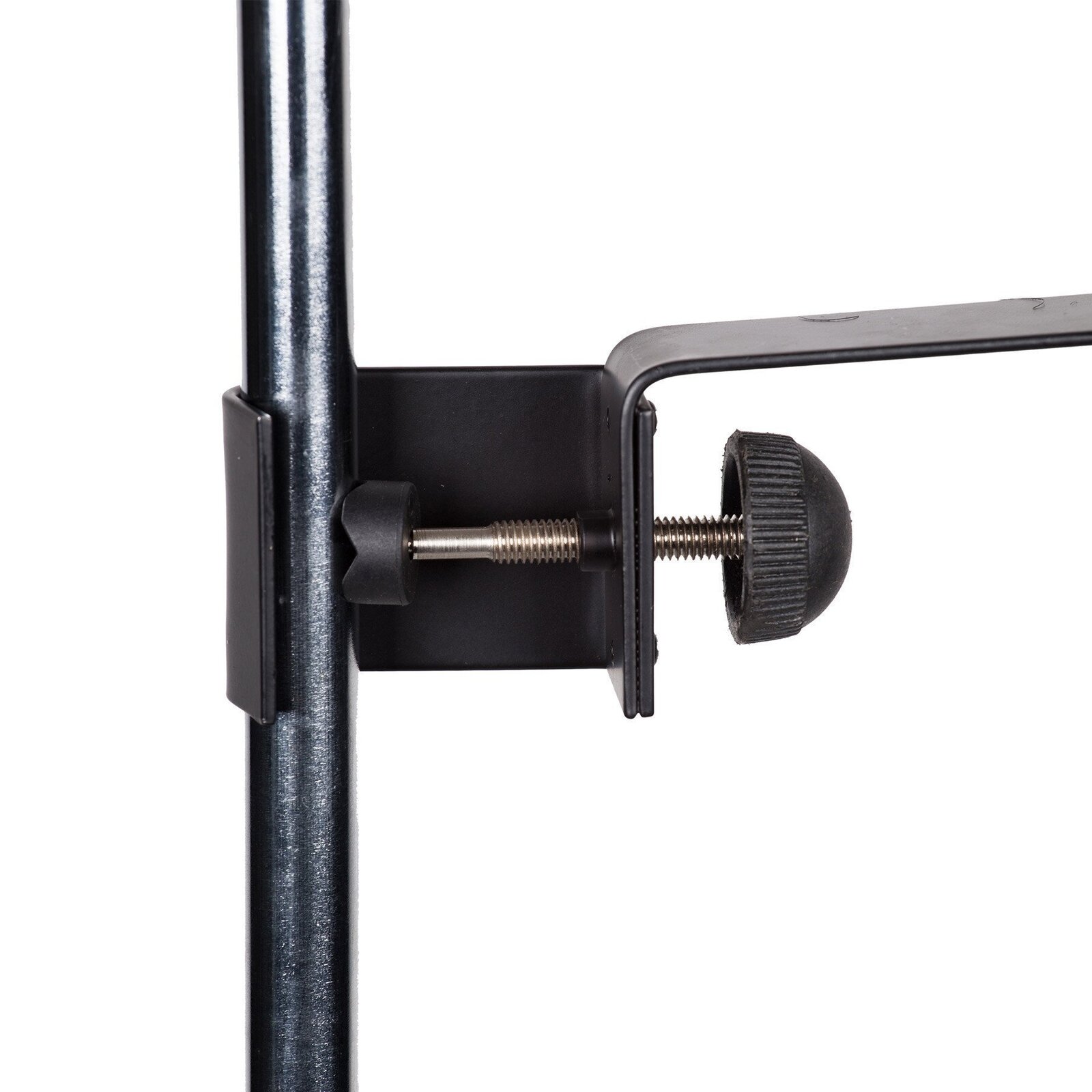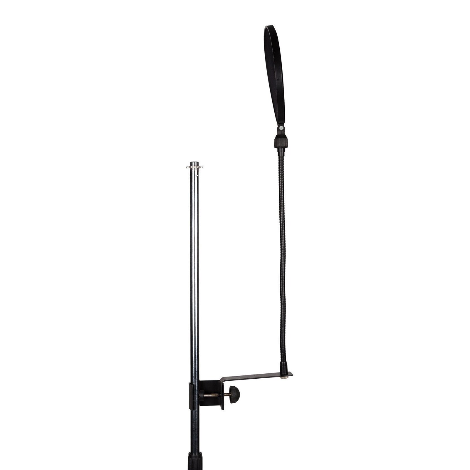 Easily clips onto microphone stand with its extended arm clamp. Fully adjustable screen.
