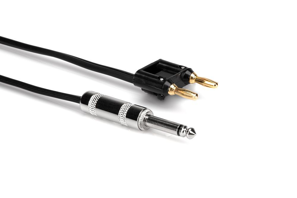 Speaker Cable, Hosa 1/4 in TS to Dual Banana, Black Zip, 5 ft | Designed to provide years of dependable service | High-quality components and world-class manufacturing combine to deliver products of exceptional value | Oxygen-Free Copper (OFC) conductors for lower resistance | Black zip-style jacket for low visibility and ease of termination | Intended for high-current applications only, not line-level signals | Lifetime warranty