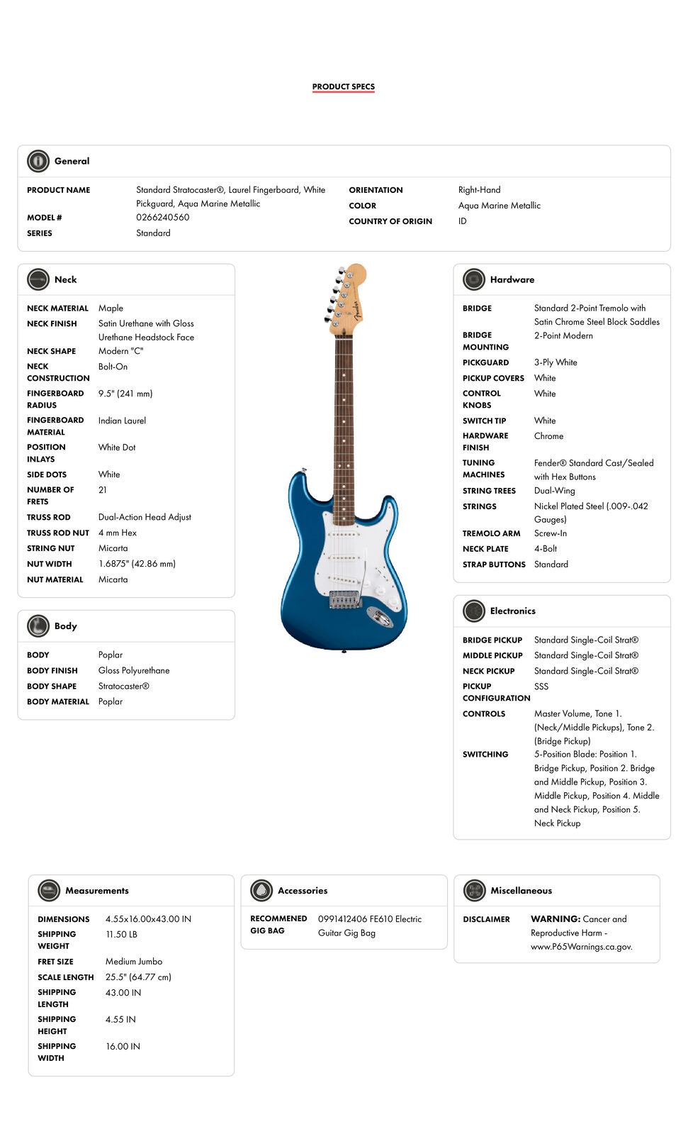 Standard Stratocaster®, Laurel Fingerboard, White Pickguard, Aqua Marine Metallic