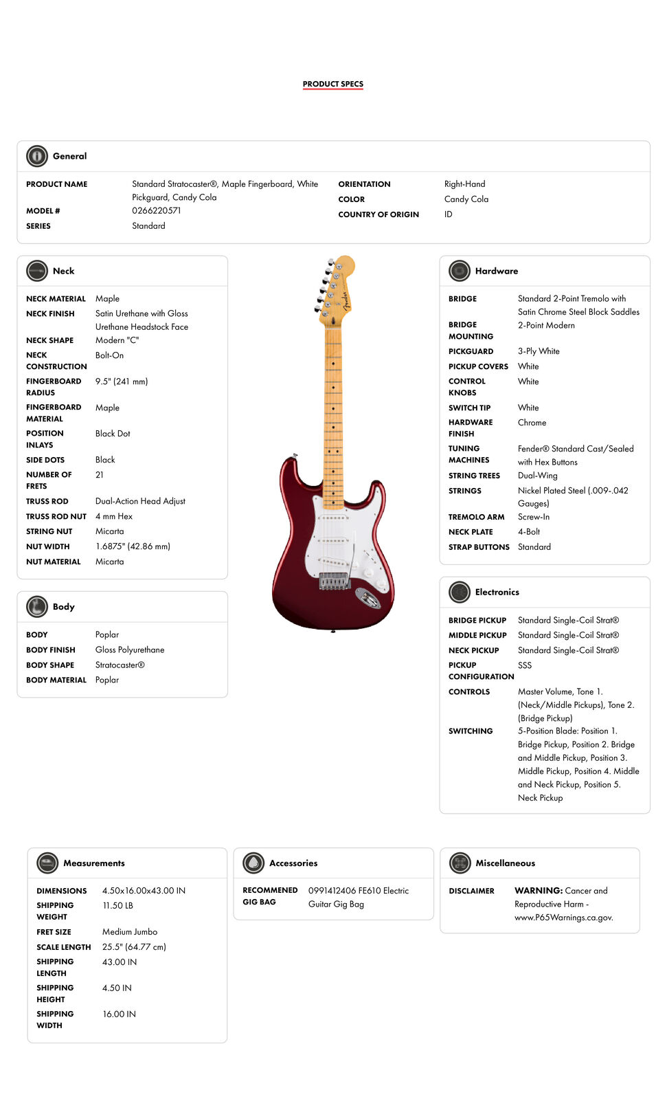 Standard Stratocaster®, Maple Fingerboard, White Pickguard, Candy Cola