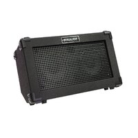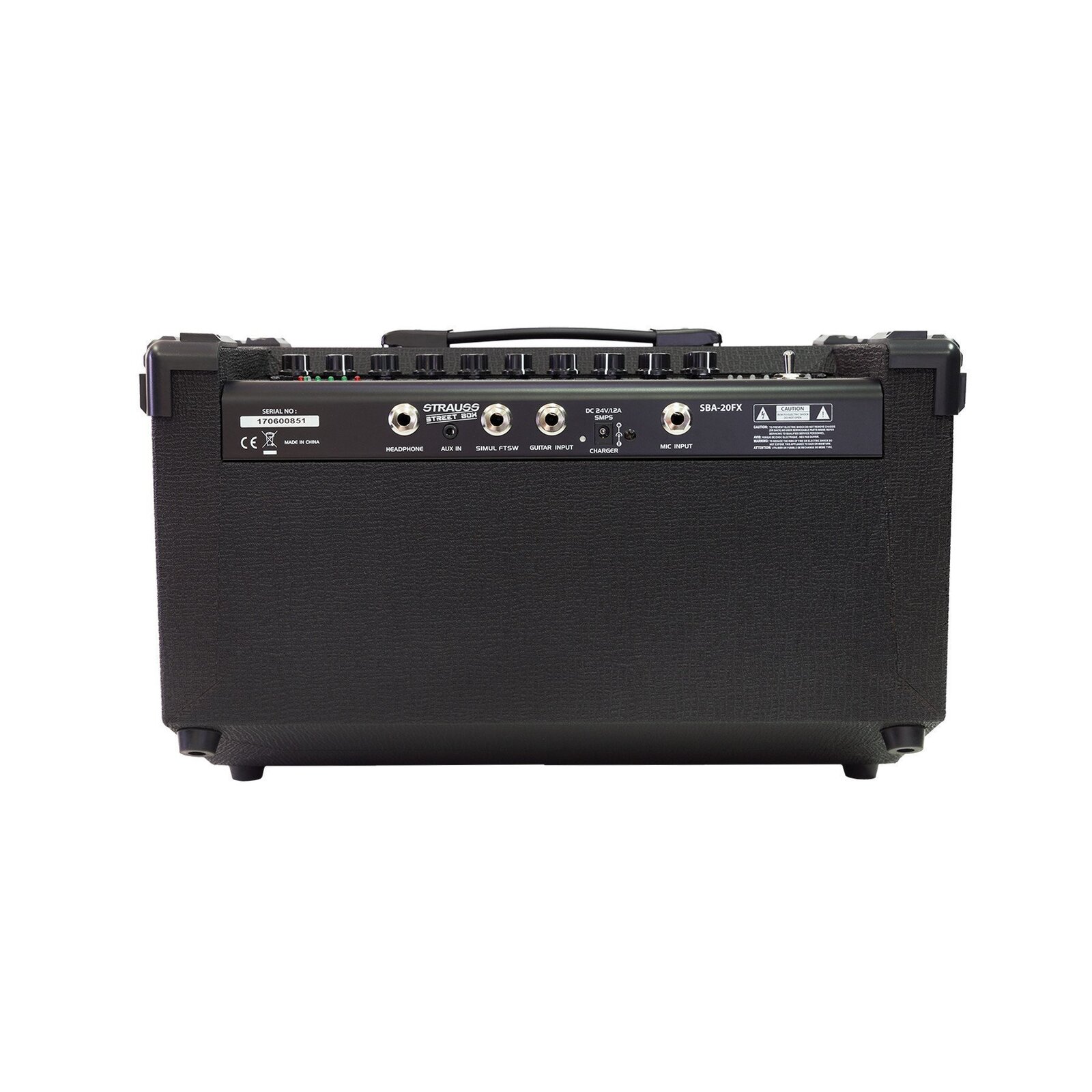 The Strauss SBA-20 is a dual channel, multi-purpose, solid state amplifier ideal for buskers. Featuring eight programmable simulator channels with save function, footswitchable 5-mode equaliser with bass boost and mode switch, stereo Blutooth or RCA AUX in, headphone out and a front port tilt back cabinet design, the SBA-20 is truly a remarkable tool for outdoor performers. This powerful little amplifier can be powered via the included 12V DC adaptor or the inbuilt Lithium-ion 18.5V/2200mAh battery.