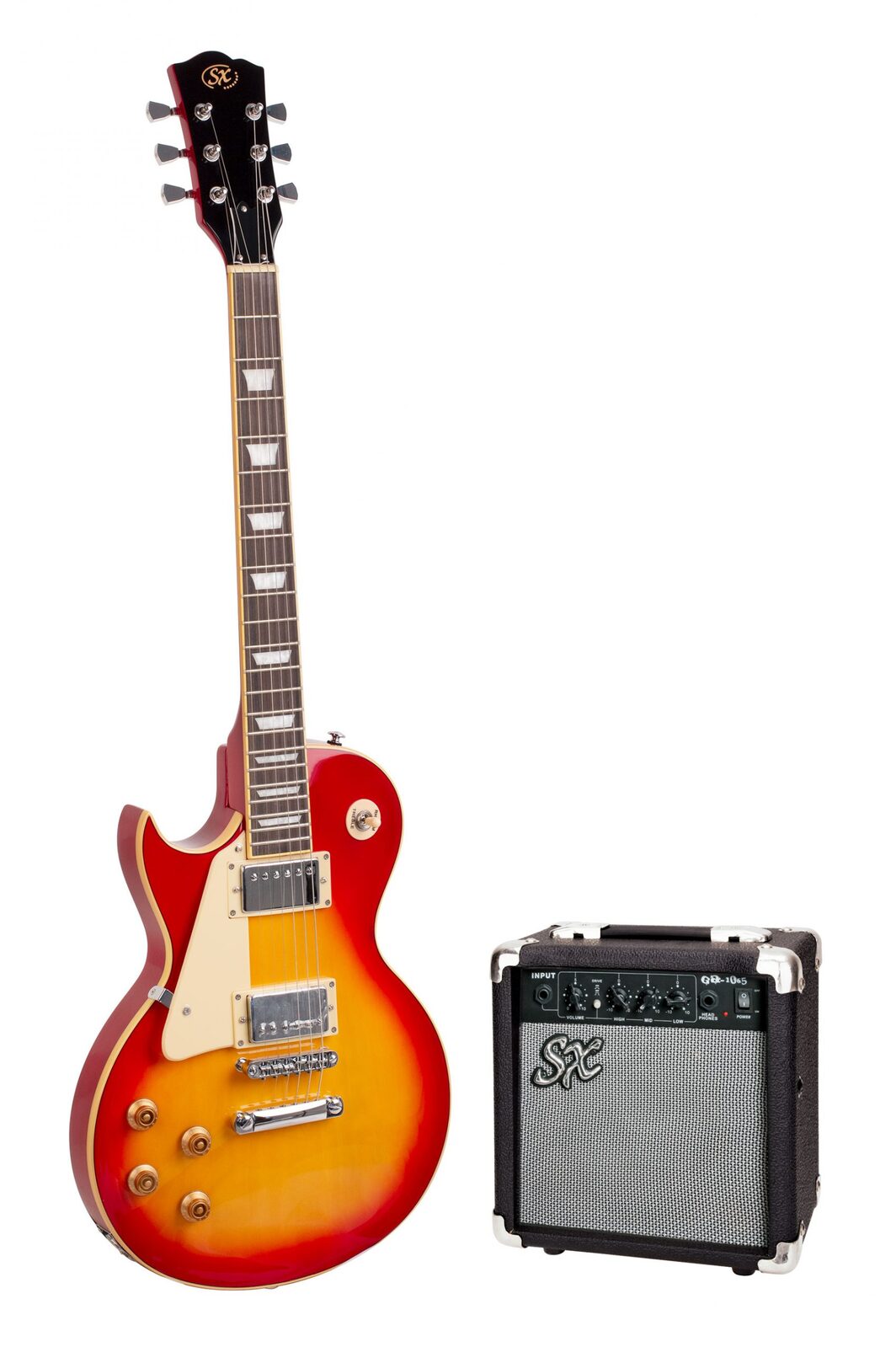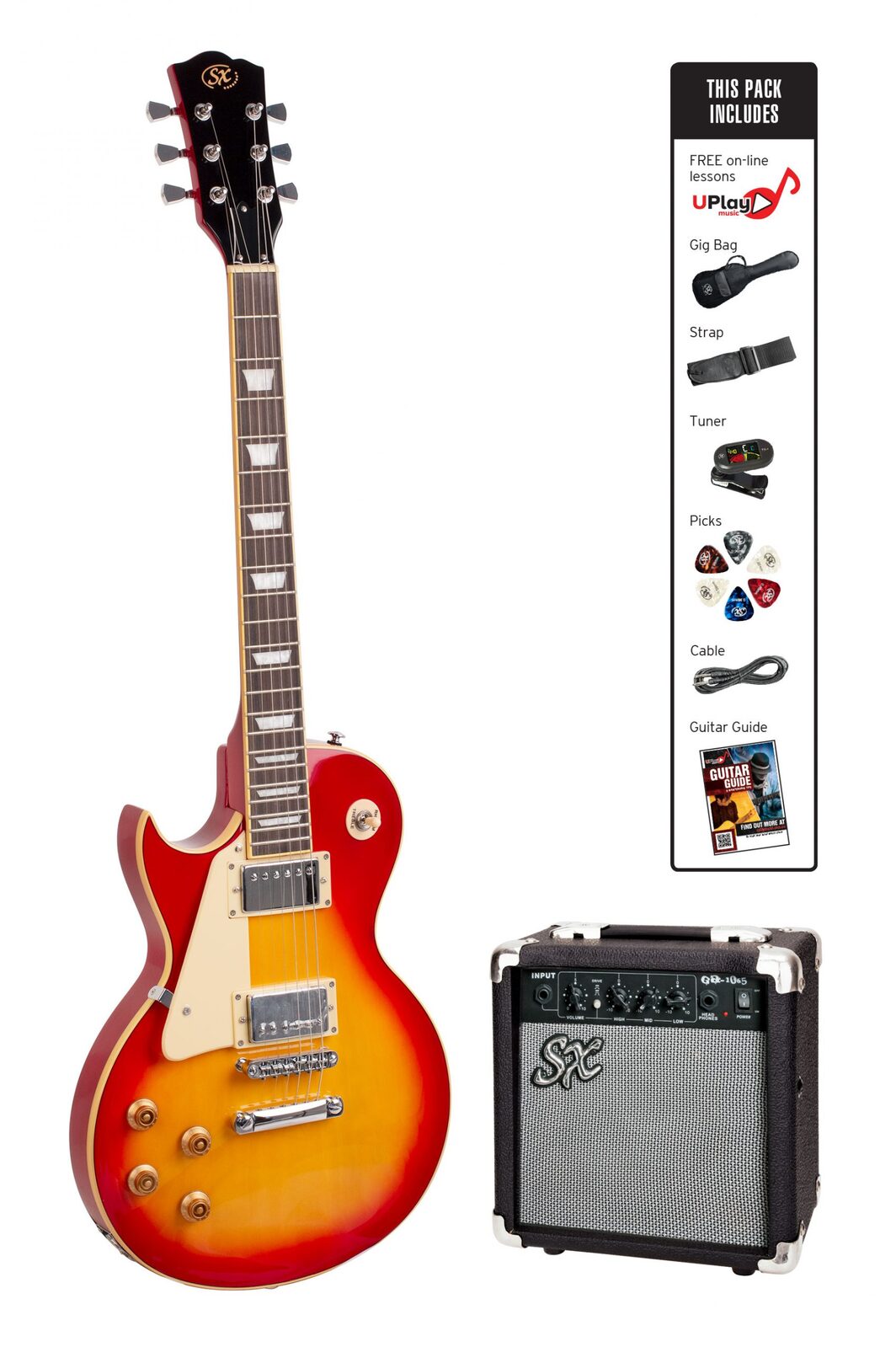 Chrome diecast machine heads with tulip buttons. Chrome Tune-O-Matic bridge and tailpiece. Supplied with SX clip-on tuner,7mm padded gig bag, strap, picks, lead and UPlay Guitar Guide with free online lessons. SX AGA1065 10 watt amplifier with 6½” speaker Plus: SX clip-on tuner, 7mm padded gig bag, strap, picks, lead and UPlay Guitar Guide with free online lessons. full colour display box. Cherry Sunburst.
