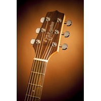 Other great features include a pinless rosewood bridge, synthetic bone nut and split bridge saddle, rosewood headcap, pearloid rosette and dot inlays, chrome diecast tuners and a beautiful gloss finish. Available in Natural and Black.