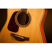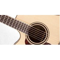 Premium design appointments include elegant ivory body binding with dark wood purfling, a rosette featuring concentric rings and wood marquetry, a rosewood fingerboard with ivory binding and wood "dot-in-dot" inlays, gold tuners with amber buttons, a natural bone nut, elegant red tortoise pickguard and a gloss natural finish.