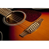 Featuring a solid spruce top and flame maple back and sides, the GJ72CE12 produces all the lush, robust sound that players expect from a jumbo 12 string guitar. The slim maple neck and 12" radius bound rosewood fingerboard provide great feel and playability, while the onboard Takamine TK40D preamp system gives you a built in tuner, three band EQ and gain controls, mid contour switch, notch filter and EQ bypass switch for the ultimate in versatility and sound quality.