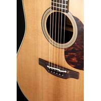 The pre-aged properties of the Takamine Solid 'Thermal Top' with Solid American Mahogany back and sides deliver an extra measure of low-end horsepower with this classic non cutaway dreadnought. Grained ivoroid binding and faux tortoise shell pick guard, open gear butterbean tuners and understated 'T' logo appropriately accentuate the wide-open vintage tone of this killer instrument.