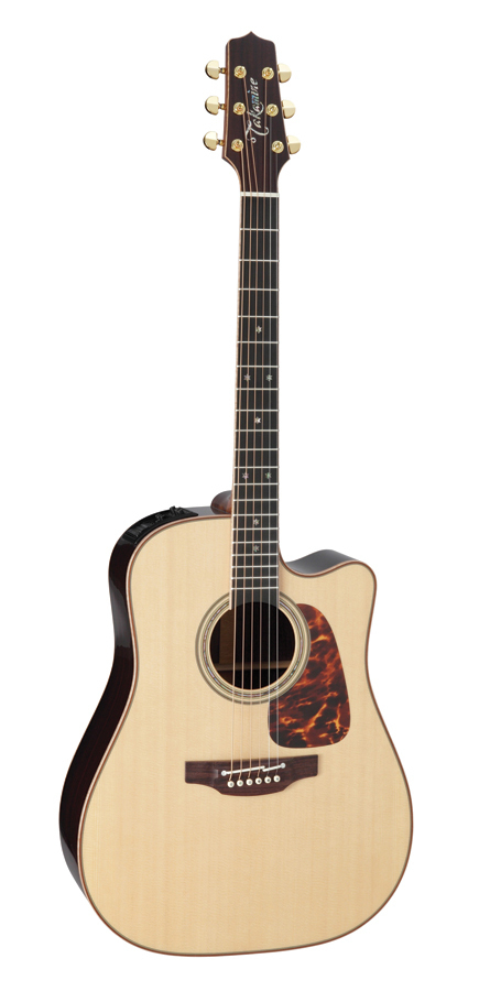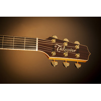 Premium design appointments include an ebony fingerboard with ivory binding, abalone "snowflake" inlays, a dark rosewood headcap with abalone Takamine logo, gold tuners with gold buttons, a natural bone nut and smooth gloss natural finish.
