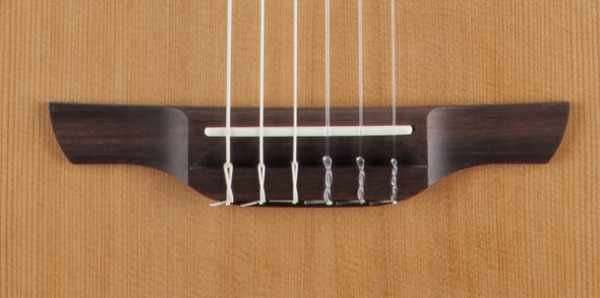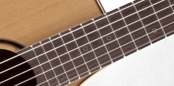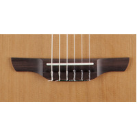 The solid cedar top features hand-scalloped X bracing and ivory binding, with dark purfling and a gorgeous concentric-ring rosette with wood marquetry. An elegant Venetian cutaway offers optimum access to the upper registers. The unique Takamine split-saddle bone bridge provides faultless intonation and excellent acoustic coupling to the top.