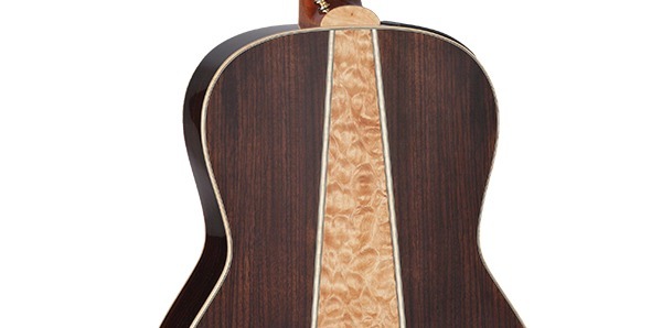 Other premium features include maple body, neck and headstock binding, dark wood rosette and body purfling, synthetic bone nut and split bridge saddle, rosewood headcap, abalone dot inlays, gold diecast tuners with black buttons, and a beautiful gloss finish.