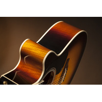 It features a resonant solid spruce top with scalloped "X" top bracing for superior balance and articulation, a solid flame maple back and flame maple sides, a convenient Venetian cutaway for easy access to the upper reaches of the fingerboard, and elegant body binding with black and white purfling and mother-of-pearl rosette.