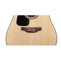 Other great features include a synthetic bone nut and split bridge saddle, rosewood headcap, abalone rosette and dot inlays, gold diecast tuners and a beautiful gloss finish. Available in Natural.