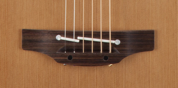 The solid cedar top features hand-scalloped X bracing and ivory binding, with dark purfling and a gorgeous concentric-ring rosette with wood marquetry. An elegant Venetian cutaway offers optimum access to the upper registers. The unique Takamine split-saddle bone bridge provides faultless intonation and excellent acoustic coupling to the top.