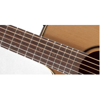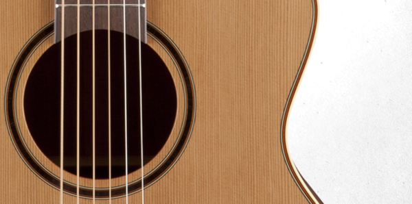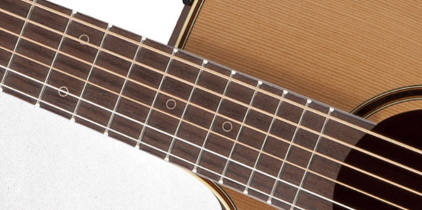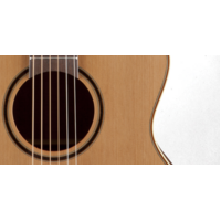 The solid cedar top features hand-scalloped X bracing and ivory binding, with dark purfling and a gorgeous concentric-ring rosette with wood marquetry. An elegant Venetian cutaway offers optimum access to the upper registers. The unique Takamine split-saddle bone bridge provides faultless intonation and excellent acoustic coupling to the top.