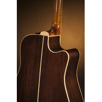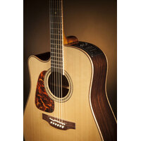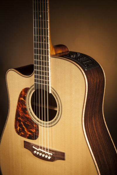 Takamine's powerful left handed P7DCLH combines tradition with contemporary refinements; a solid spruce top with scalloped "X" top bracing and solid rosewood back and sides for rich clarity and projection, a convenient Venetian cutaway for easy access to the upper reaches of the fingerboard, and elegant maple body binding with dark wood purfling and abalone rosette.
