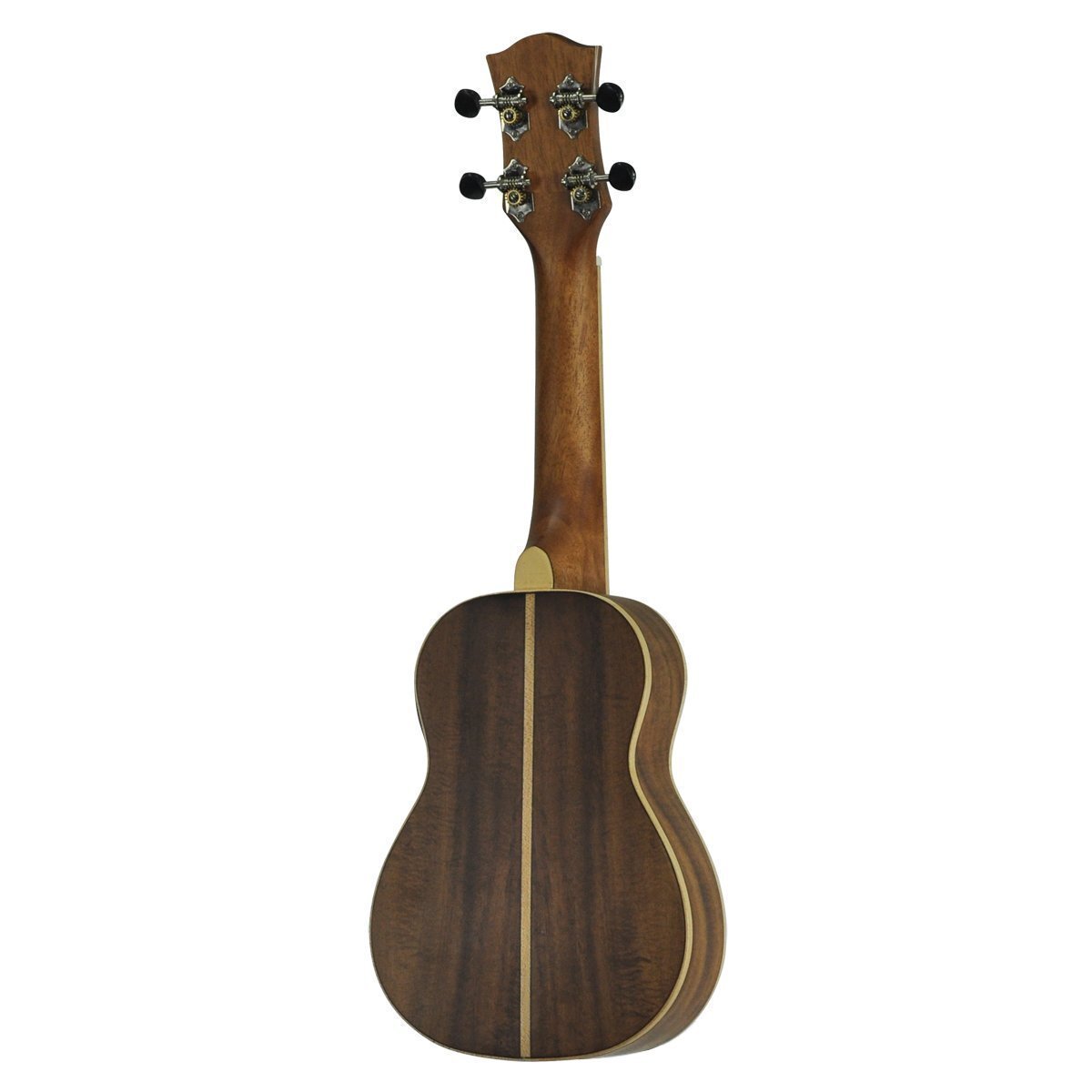 It features a Koa wood top, back & sides, Mahogany neck, Rosewood fingerboard, and chrome open back tuners with black buttons. It is fitted with high quality Aquila strings, and is superbly finished off with deluxe timber binding, rosette, heel plate and back strip.