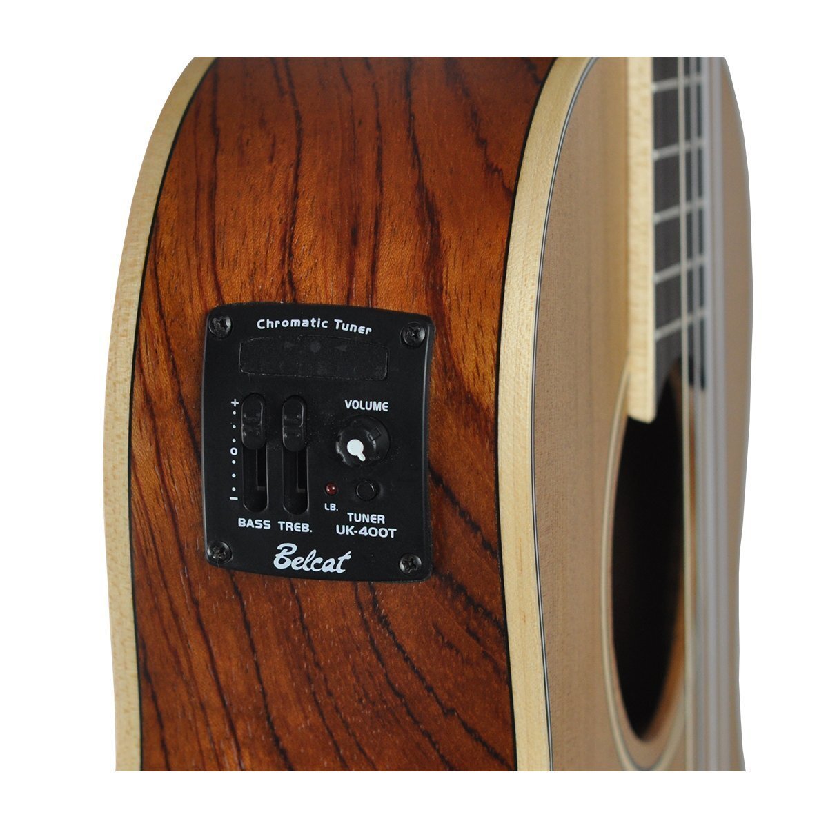 It features a Solid Cedar top, Bubinga back and sides, Rosewood fingerboard, and chrome open back tuners with black buttons. It is fitted with high quality Aquila strings, and is superbly finished off with deluxe timber binding, rosette, heel plate and back strip. The built-in Belcat 2 Band preamp and tuner also gives you the option of plugging into an amplifier, PA system and a wide range of recording devices.