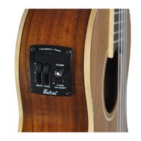 It features a Solid Koa wood top, Koa back & sides, Mahogany neck, Rosewood fingerboard, and chrome open back tuners with black buttons. It is fitted with high quality Aquila strings, and is superbly finished off with deluxe timber binding, rosette, heel plate and back strip. The built-in Belcat 2 Band preamp and tuner also gives you the option of plugging into an amplifier, PA system and a wide range of recording devices.