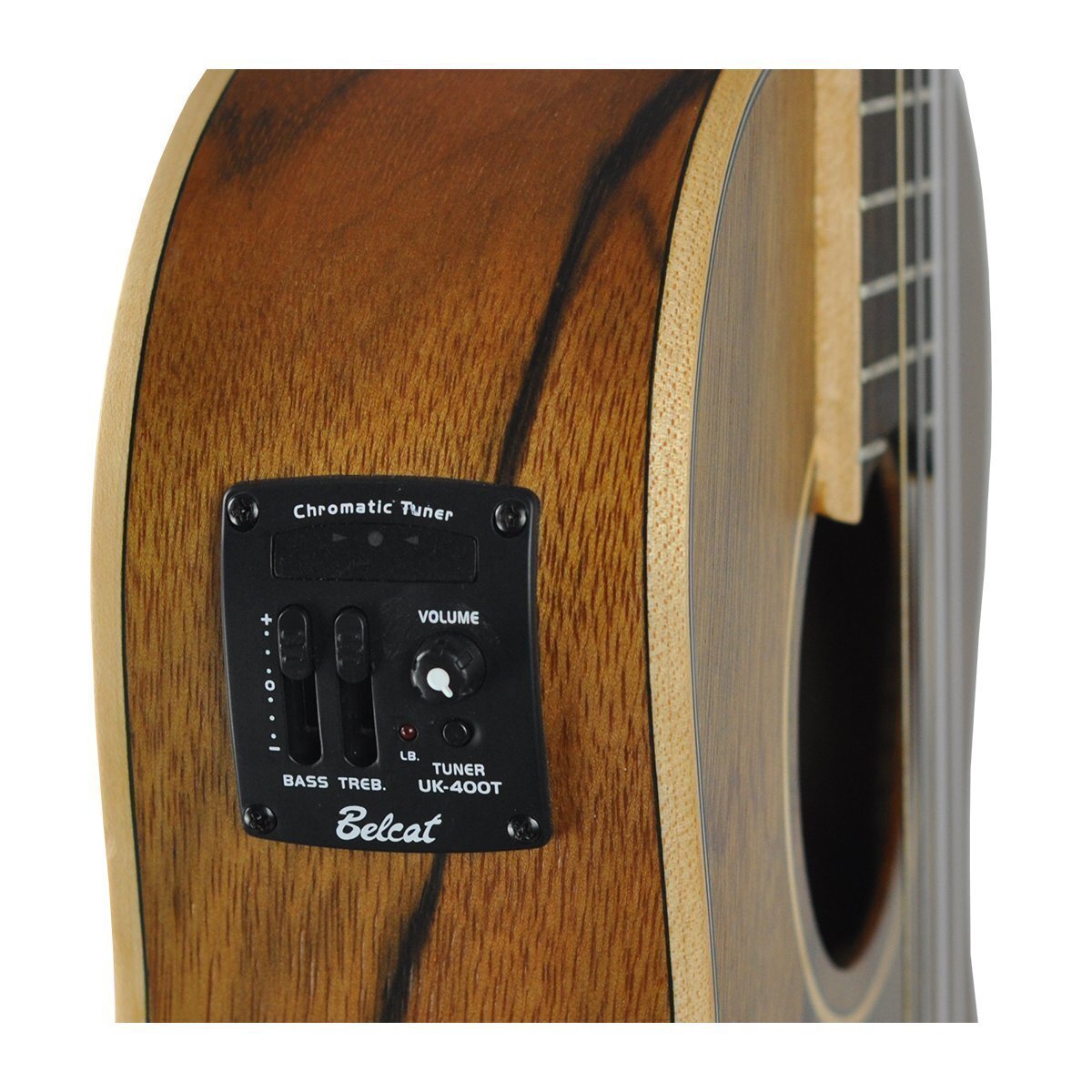 It features a Dao wood top, back & sides, Mahogany neck, Rosewood fingerboard, and chrome open back tuners with black buttons. It is fitted with high quality Aquila strings, and is superbly finished off with deluxe timber binding, rosette, heel plate and back strip. The built-in Belcat 2 Band preamp and tuner also gives you the option of plugging into an amplifier, PA system and a wide range of recording devices.